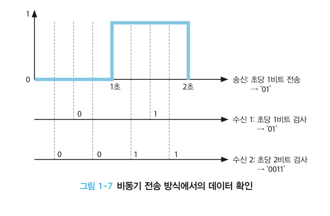 그림 1-7에서 보면 데이터 전송속도는 1 bps(bit per second)인데, 수신장치 역시 1 bps로 검사한다면 01이라는 맞는 데이터를 수신하겠지만, 2 bps로 검사하게 될 경우 0011이라는 전혀 다른 데이터를 받게 된다. 따라서 비동기 방식을 사용할 경우에는 보내는 쪽과 받는 쪽의 속도를 일치시켜야 된다.