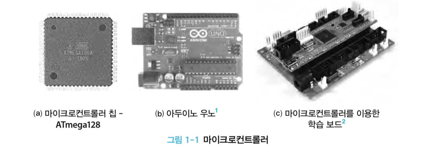 위의 그림에서 보면 (a)가 마이크로컨트롤러이고, (b)와 (c)는 마이크로컨트롤러라고 부르기도 하지만 이들은 '마이크로컨트롤러 보드'에 해당한다. 마이크로컨트롤러는 5V의 전원만 있으면 동작한다. 즉 하나의 칩으로 구현한 컴퓨터라고 할 수 있다.