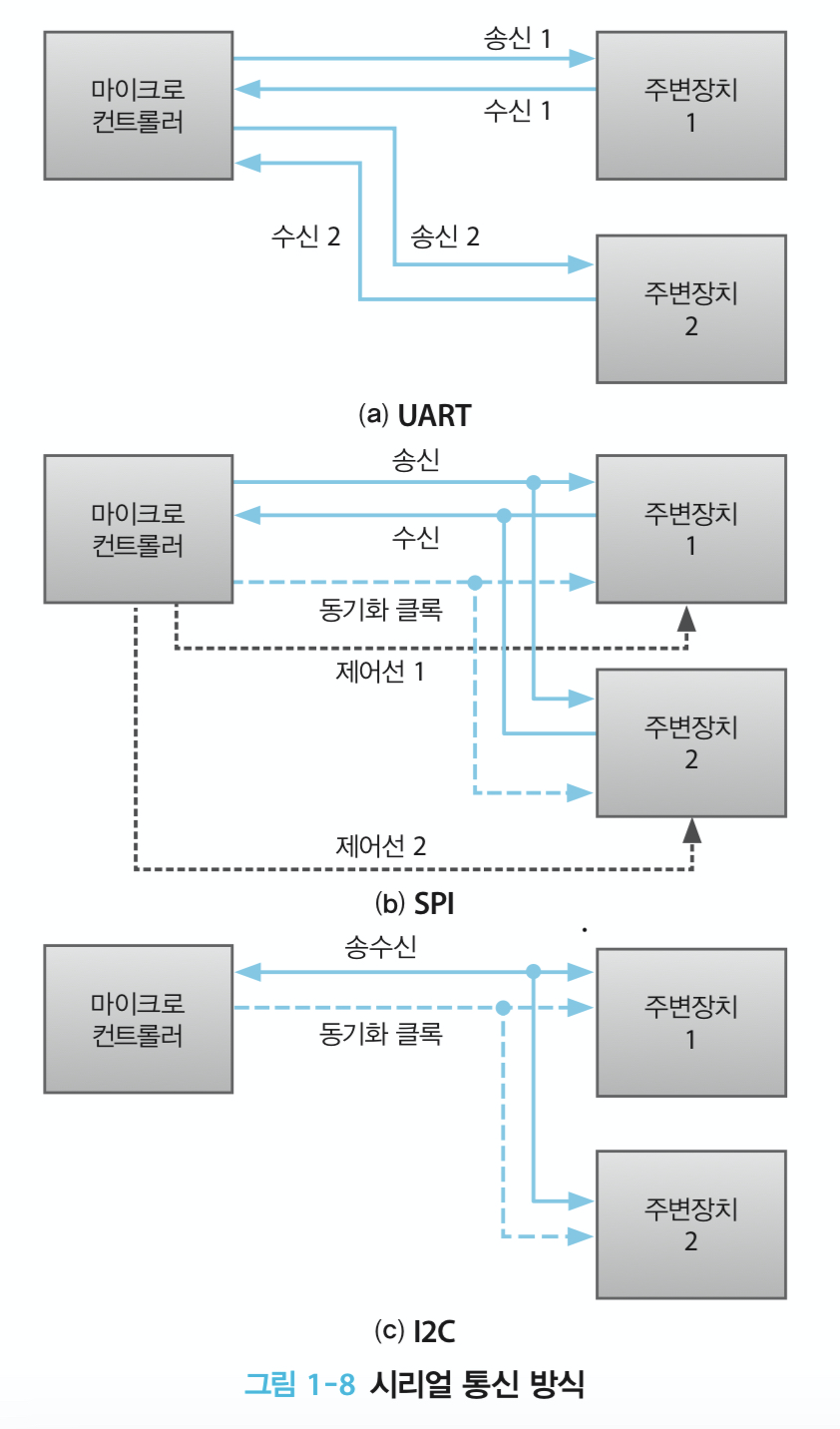 53개라고 하면 많아 보이지만 작은 크기의 LCD를 제어하는 것만 해도 13개의 핀이 필요하다. 그래서 마이크로컨트롤러에서는 데이터를 전달할 때 여러 개의 핀을 사용하는 병렬방식보다 하나의 핀을 통해 여러 번 데이터를 주고받는 직렬 방식을 선호한다.