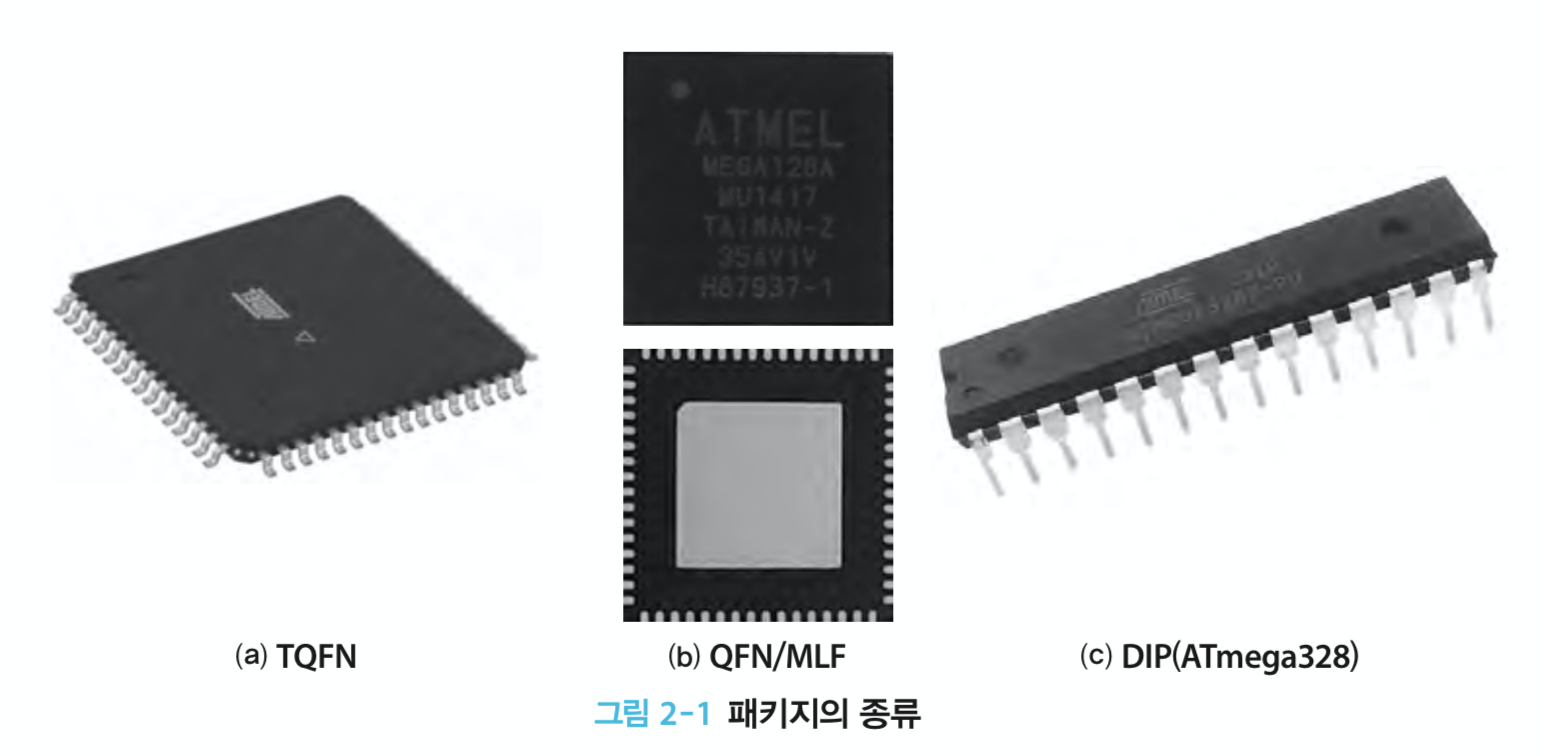 흔히 볼 수 있는 ATmega128은 TQFN 패키지와 QFN/MLF 패키지인데 둘의 차이는 단지 핀이 외부로 노출되어 있는지의 여부이다. DIP의 경우는 브레드보드에 꽂아 사용할 수 있는데, 64개의 핀을 가지고 있는 ATmega128은 이 타입으로는 제작하지 않는다.