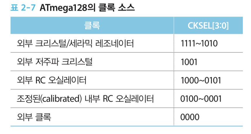 ATmega128에서 사용할 수 있는 클록 소스는 여러 가지 종류이며, CKSEL(Clock Selection) 퓨즈 비트를 통해 설정할 수 있다. 그러나 디폴트로 내부 RC 오실레이터를 사용하도록 설정되어 있으므로 별도로 외부 클록 없이도 동작한다.(질문: 그러면 왜 별도로 크리스털 오실레이터를 사용하는 거지?)