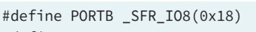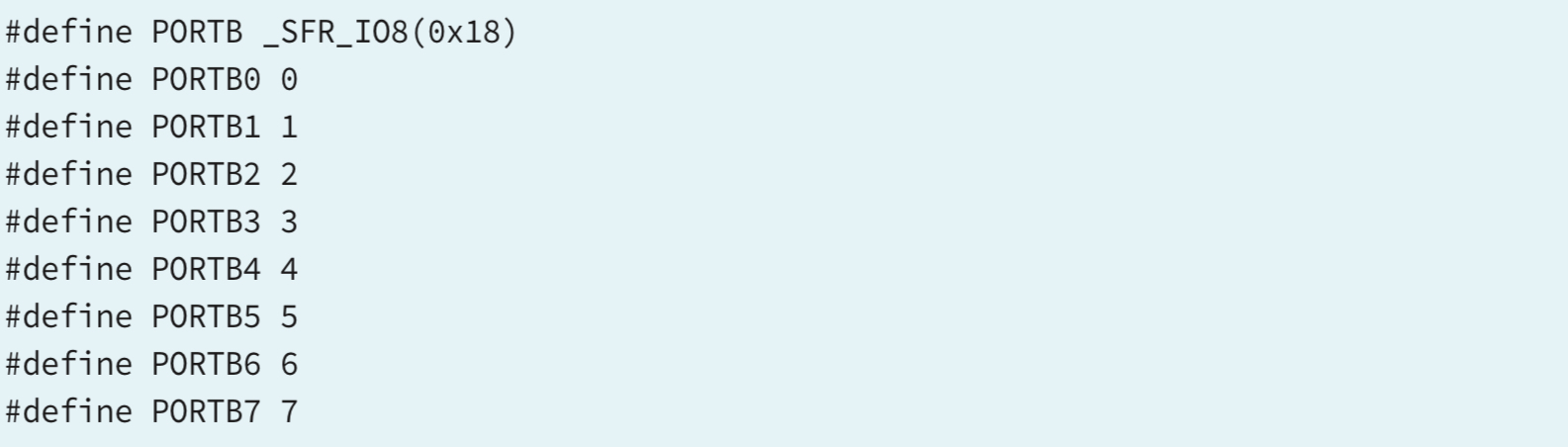 위에서 보면 PORTB라는 레지스터의 이름은 실제 0x18 번지의 입출력 메모리 주소이다. PORTB는 실제로 마이크로컨트롤러 내부에서 계산된 값이 출력되는 8비트 레지스터를 가리키는 메모리이며 8개의 핀이 연결되어 있고, 각 핀을 개별적으로 제어하는 것이 가능하다.